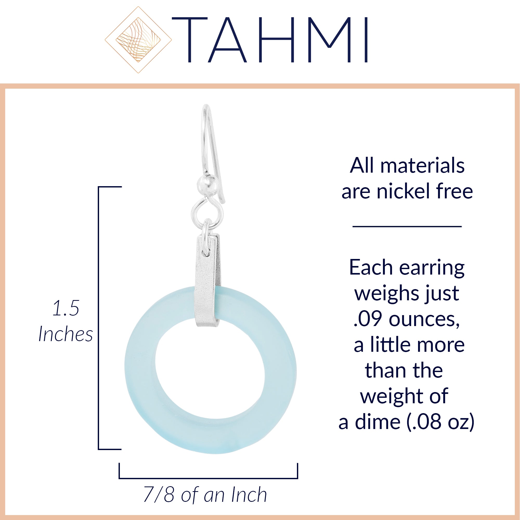 The lightweight pastel blue cultured sea glasscirclessit at the base of a pair of Argentium sterling silver dangle findings, complete with Tahmi’s signature metal strap design.The texture on the sterling silverstraps creates an effect that sparkles in the sunlight, reflecting the light with style. The result is simple, glamourous, sleek and versatile.