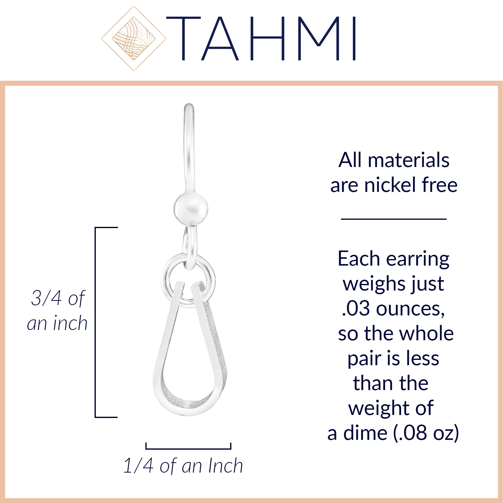 •Weight:These hanging earrings are also extremely light weight and comfortable, weighing just .03 of an ounce each - the entire pair weighs less than the weight of a dime (.08 oz)!