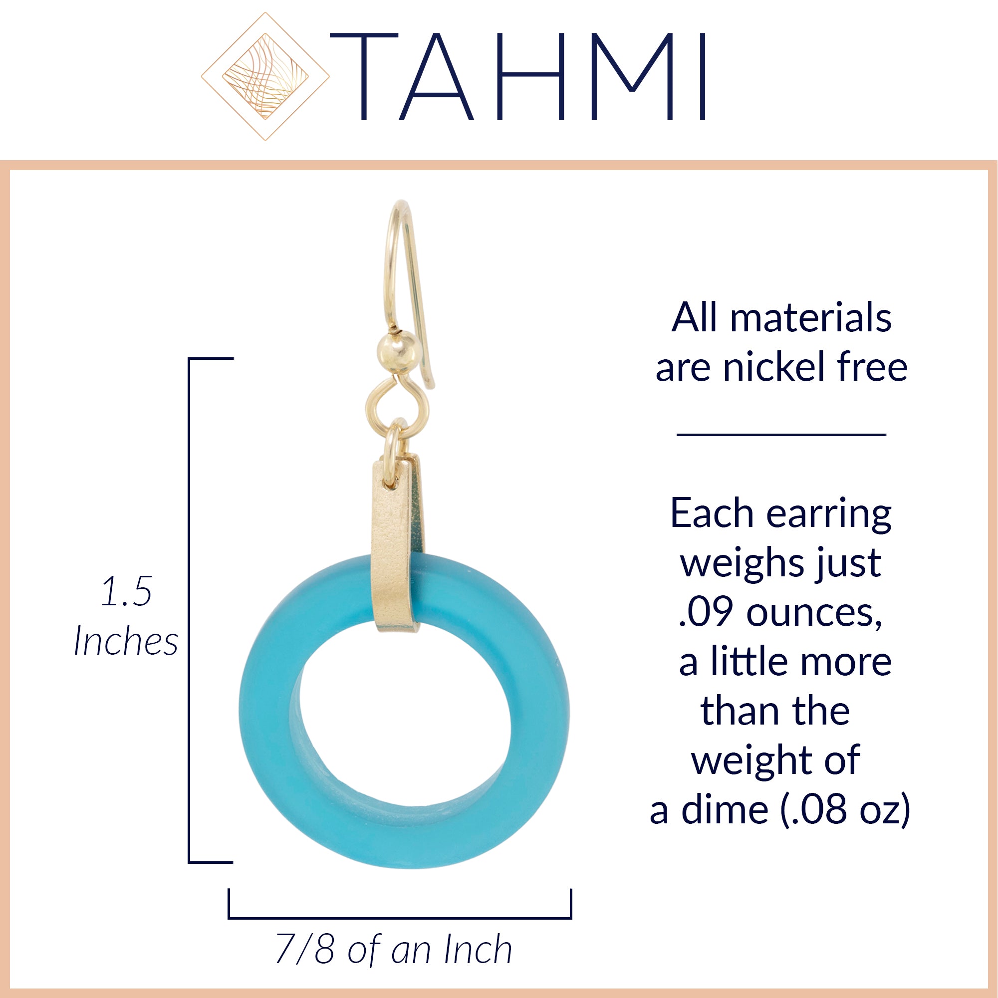The lightweight peacock blue cultured sea glass circles sit at the base of a pair of 14k gold fill dangle findings, complete with Tahmi’s signature metal strap design. The texture on the 14K yellow gold fill straps creates an effect that sparkles in the sunlight, reflecting the light with style. The result is simple, glamourous, sleek and versatile.