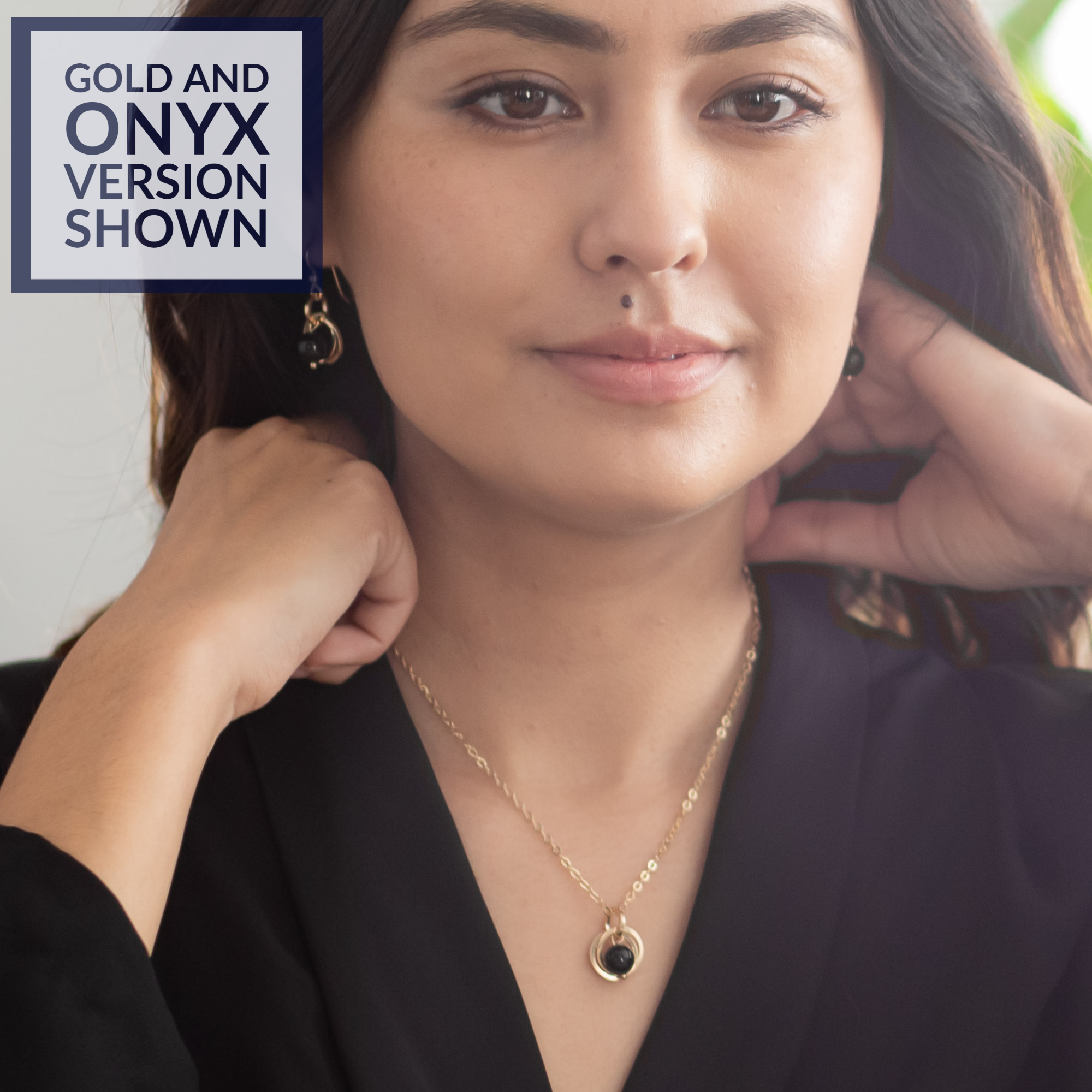 Set in the center of two flat-edged rings, this pendant has been hand-crafted using 14k gold fill for the shiniest, most durable finish. The squared-edges give a modern, sharp clean finish and reflects the light in the most beautiful way.