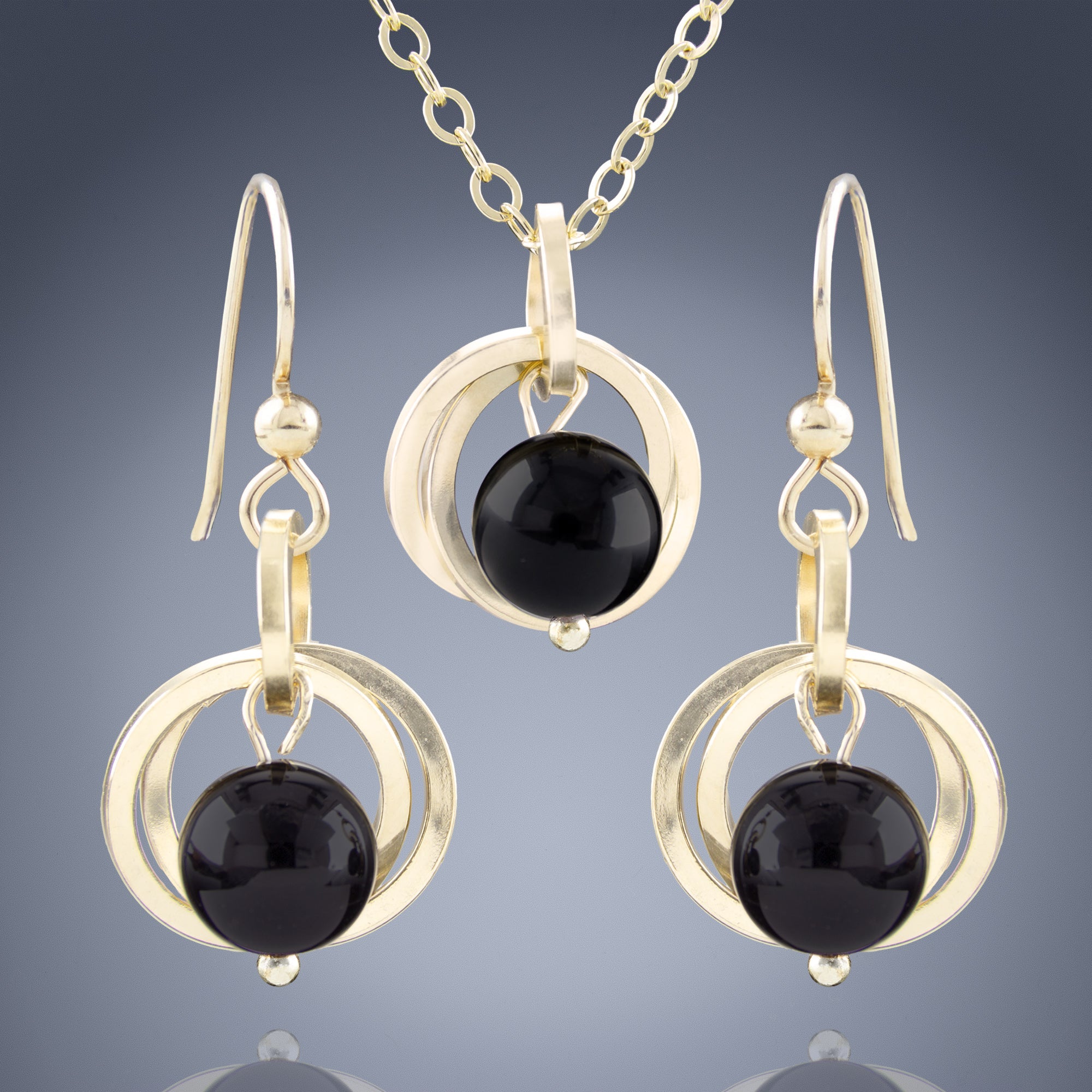 Black Onyx Gemstone Jewelry Gift Set with Dangle Earrings and Pendant Necklace in 14K Gold Fill